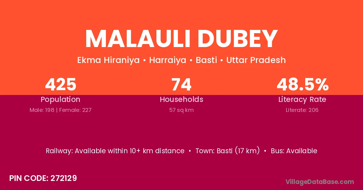 Malauli Dubey village has a total population of 425 people, of which 198 are males and 227 are females.