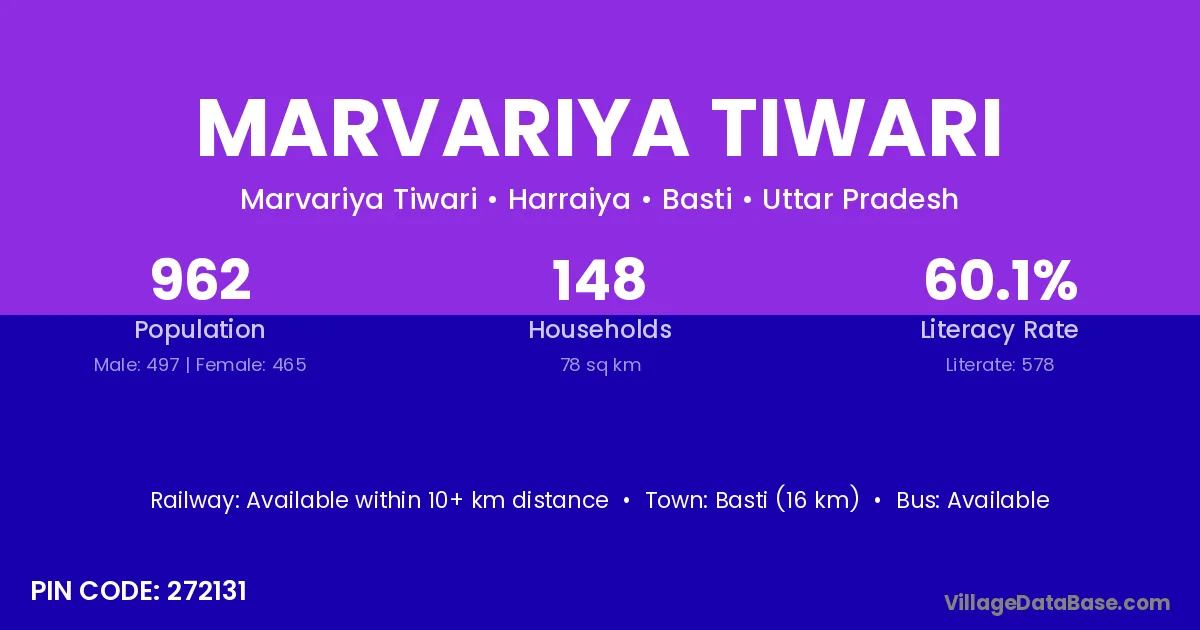 Basti (16 km) is the nearest town to Marvariya Tiwari village for major economic activities and is located approximately 16 km away.