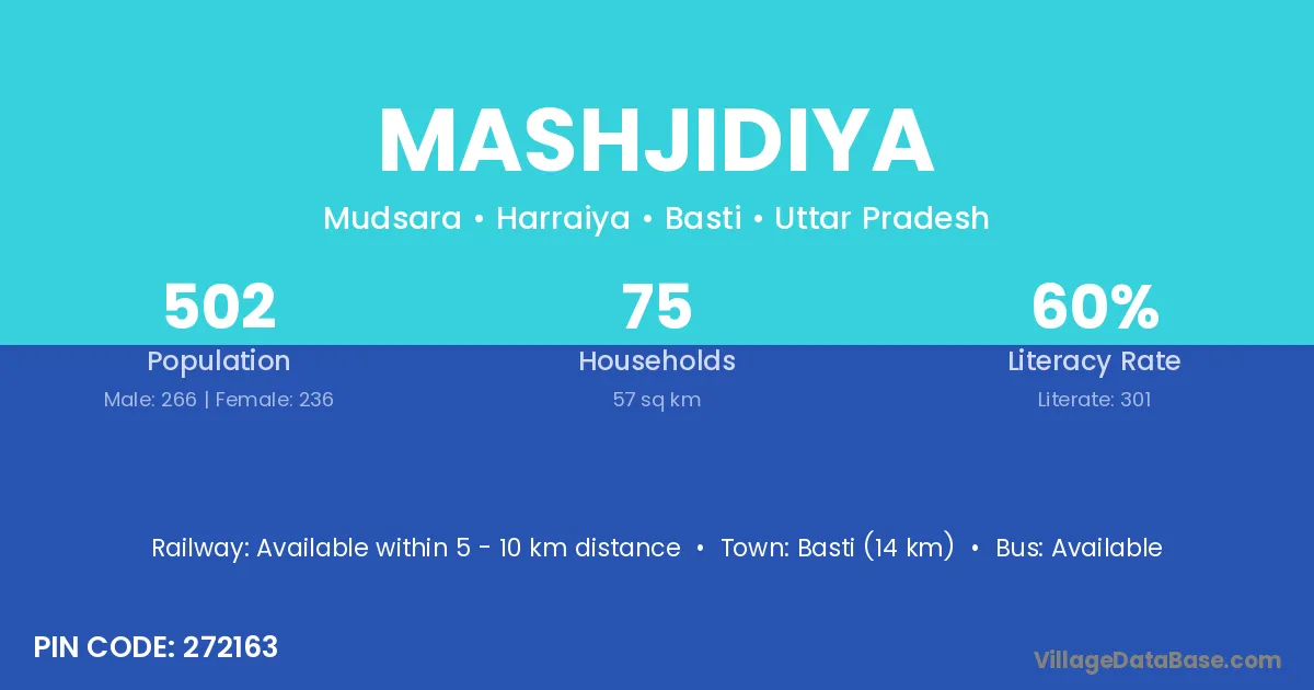 Basti (14 km) is the nearest town to Mashjidiya village for major economic activities and is located approximately 14 km away.