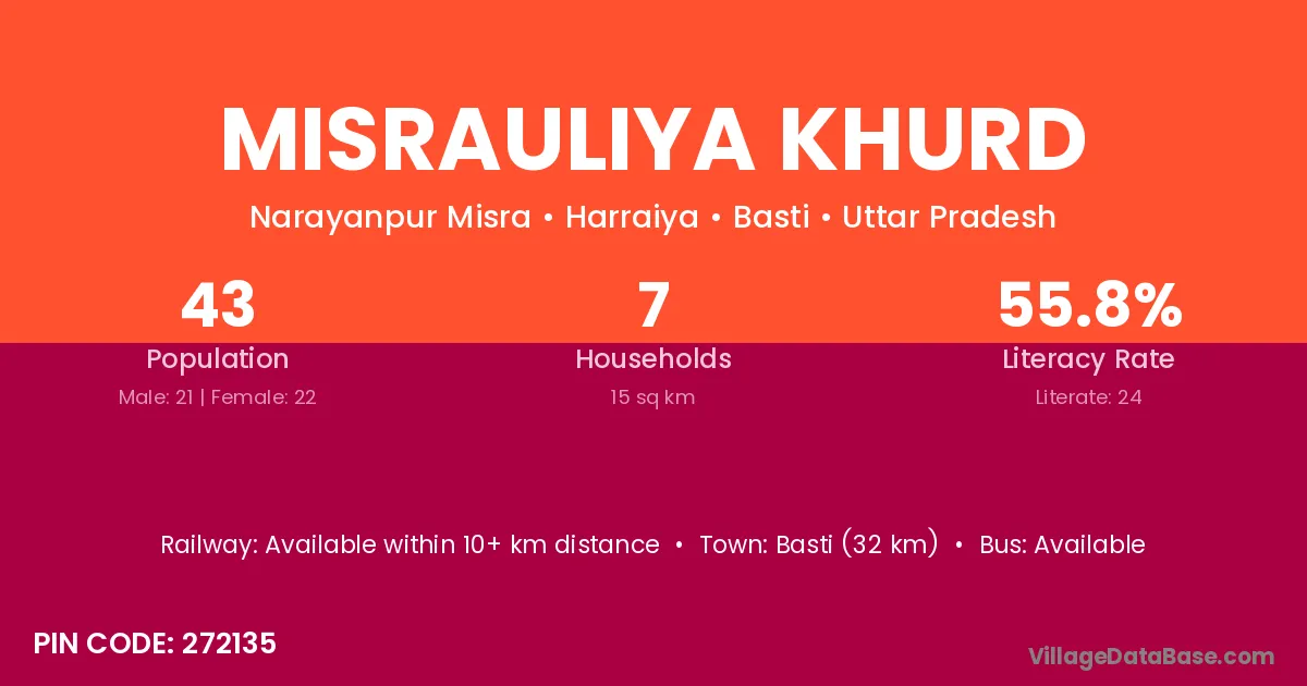 Basti (32 km) is the nearest town to Misrauliya Khurd village for major economic activities and is located approximately 32 km away.