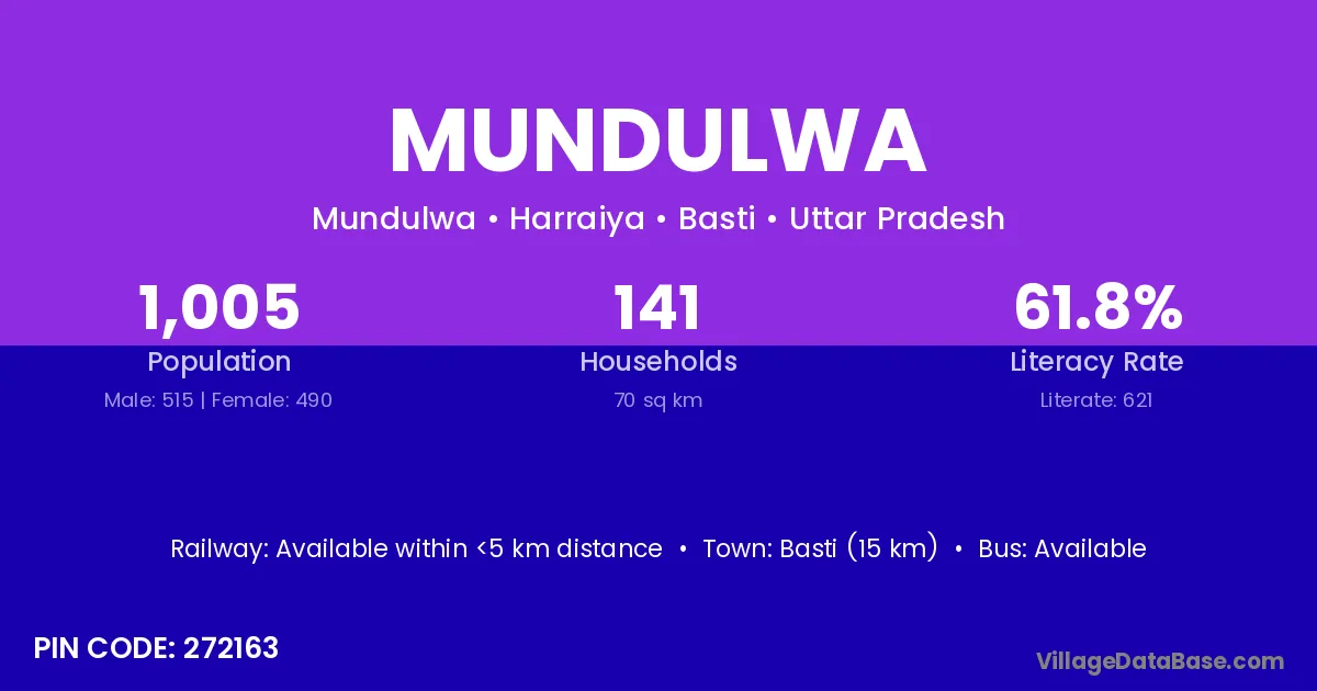 Basti (15 km) is the nearest town to Mundulwa village for major economic activities and is located approximately 15 km away.
