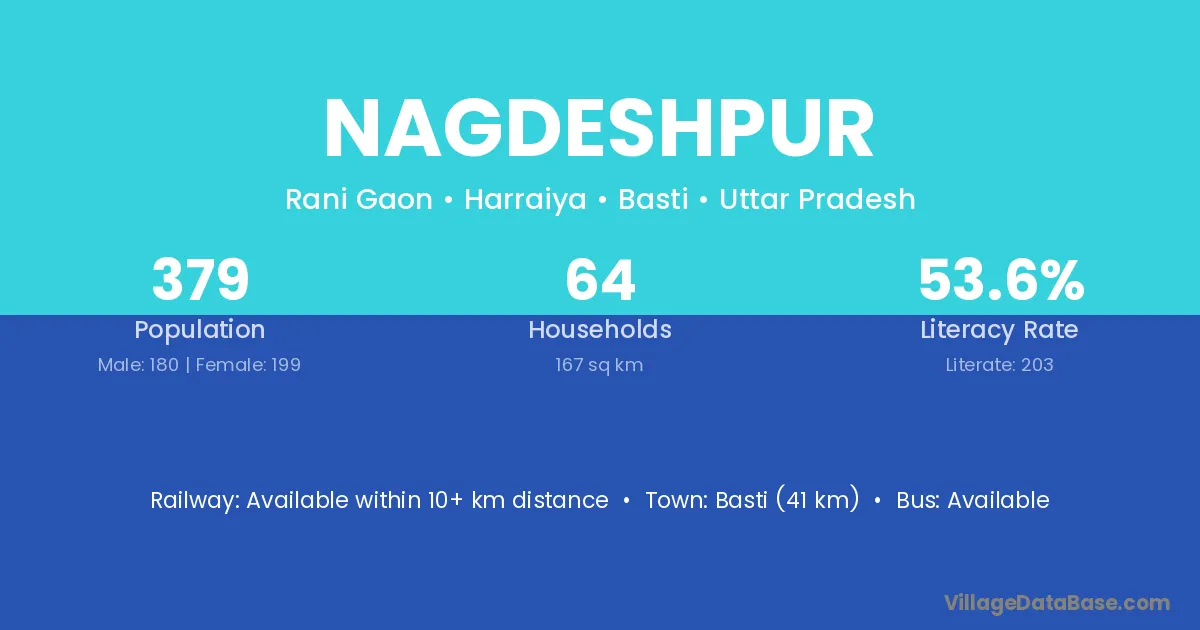 Basti (41 km) is the nearest town to Nagdeshpur village for major economic activities and is located approximately 41 km away.