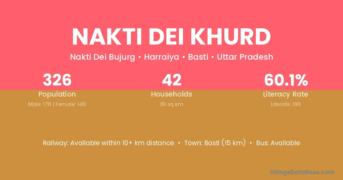 Basti (15 km) is the nearest town to Nakti Dei Khurd village for major economic activities and is located approximately 15 km away.