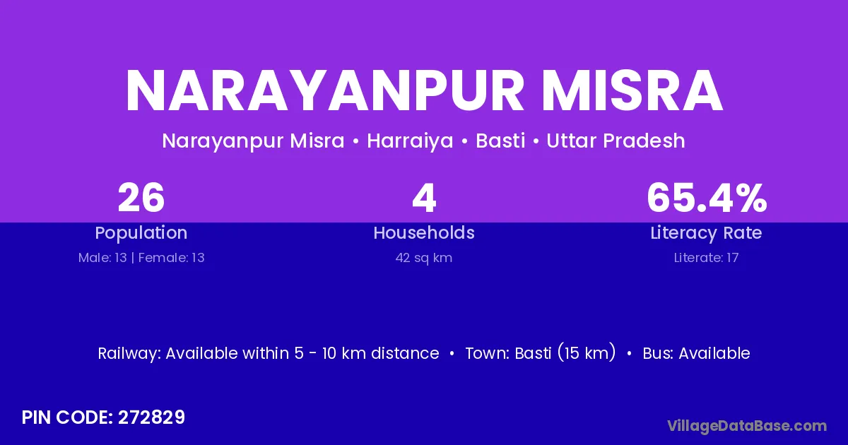 Basti (15 km) is the nearest town to Narayanpur Misra village for major economic activities and is located approximately 15 km away.