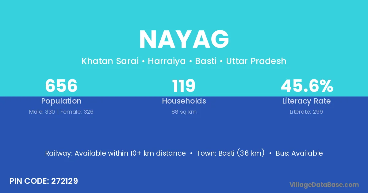 Basti (36 km) is the nearest town to Nayag village for major economic activities and is located approximately 36 km away.