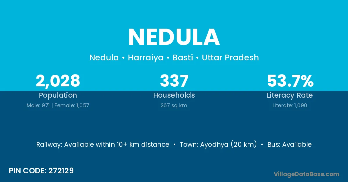 Ayodhya (20 km) is the nearest town to Nedula village for major economic activities and is located approximately 20 km away.