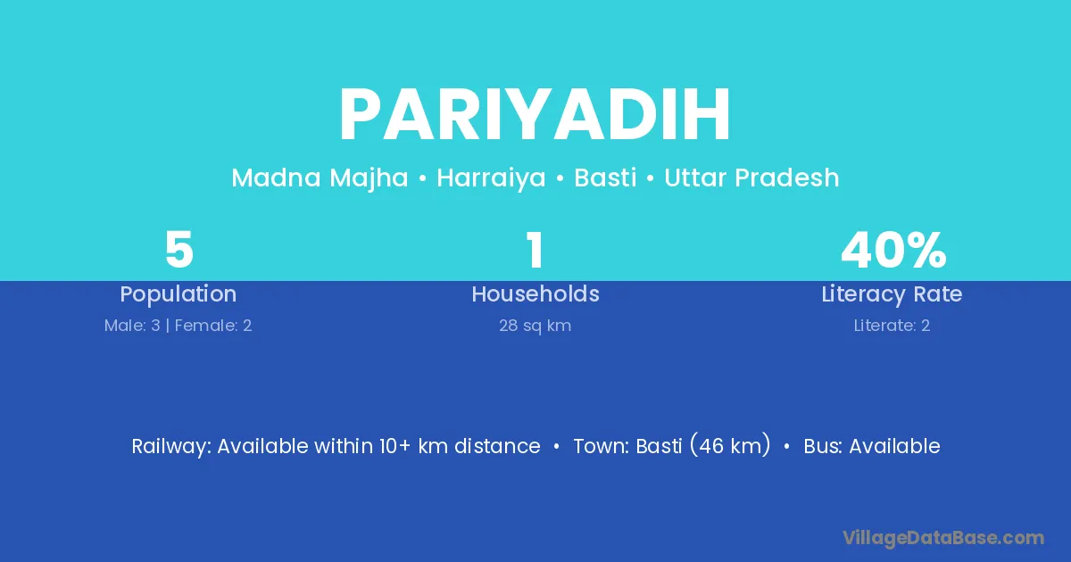 Basti (46 km) is the nearest town to Pariyadih village for major economic activities and is located approximately 46 km away.