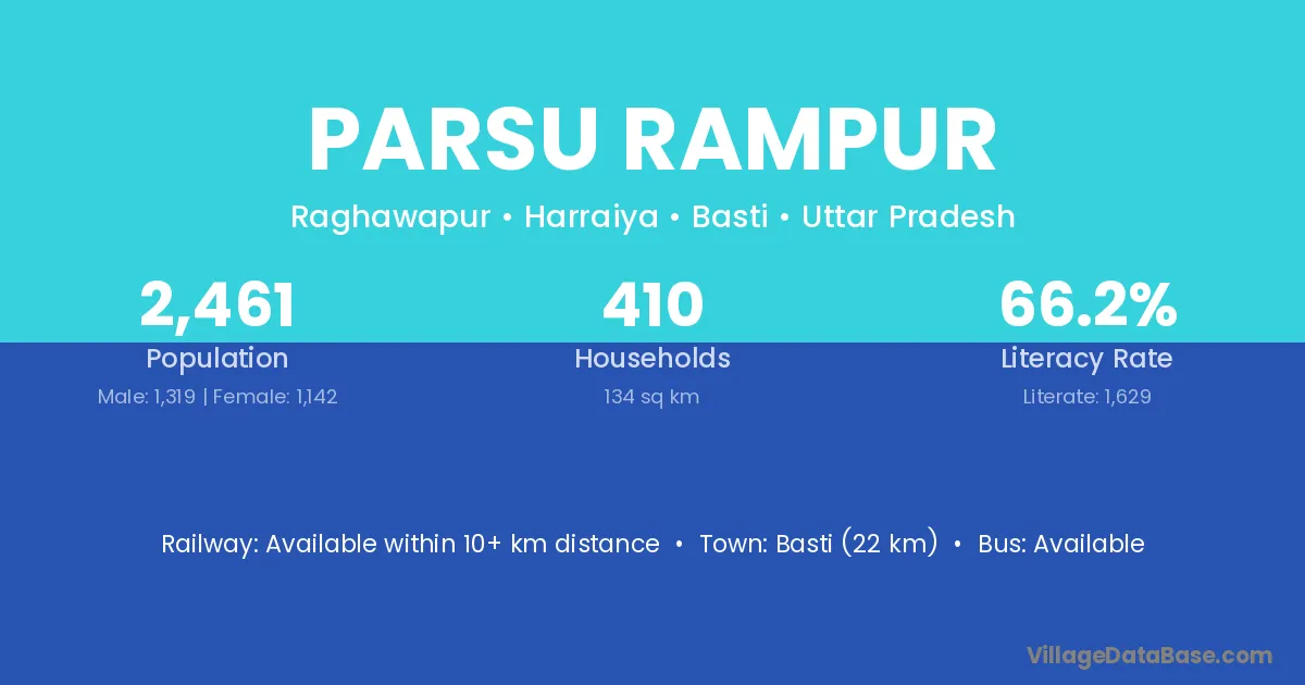 Basti (22 km) is the nearest town to Parsu Rampur village for major economic activities and is located approximately 22 km away.
