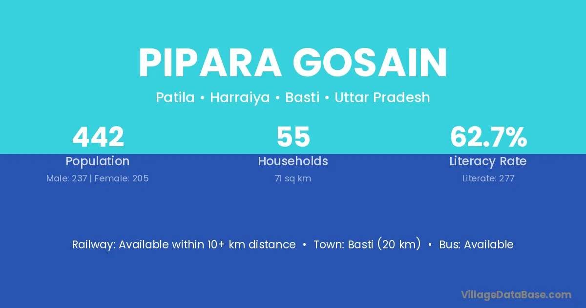 Basti (20 km) is the nearest town to Pipara Gosain village for major economic activities and is located approximately 20 km away.
