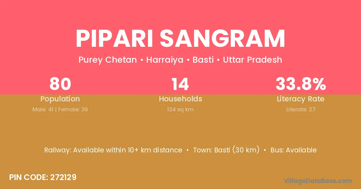 Basti (30 km) is the nearest town to Pipari Sangram village for major economic activities and is located approximately 30 km away.