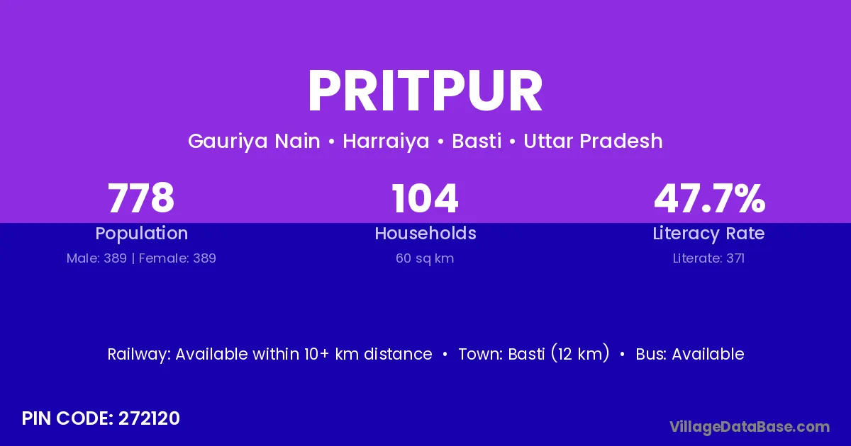 Basti (12 km) is the nearest town to Pritpur village for major economic activities and is located approximately 12 km away.