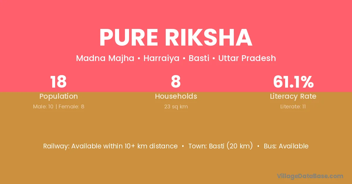 Pure Riksha village has a total population of 18 people, of which 10 are males and 8 are females.
