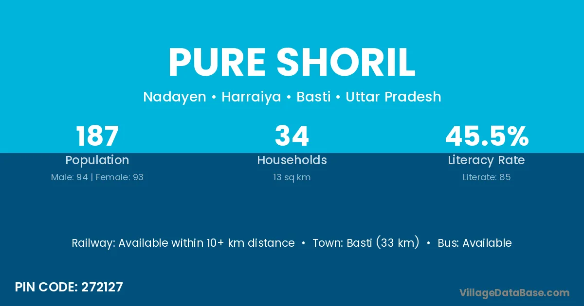 Basti (33 km) is the nearest town to Pure Shoril village for major economic activities and is located approximately 33 km away.