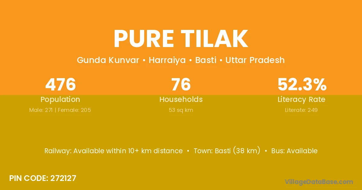 Basti (38 km) is the nearest town to Pure Tilak village for major economic activities and is located approximately 38 km away.