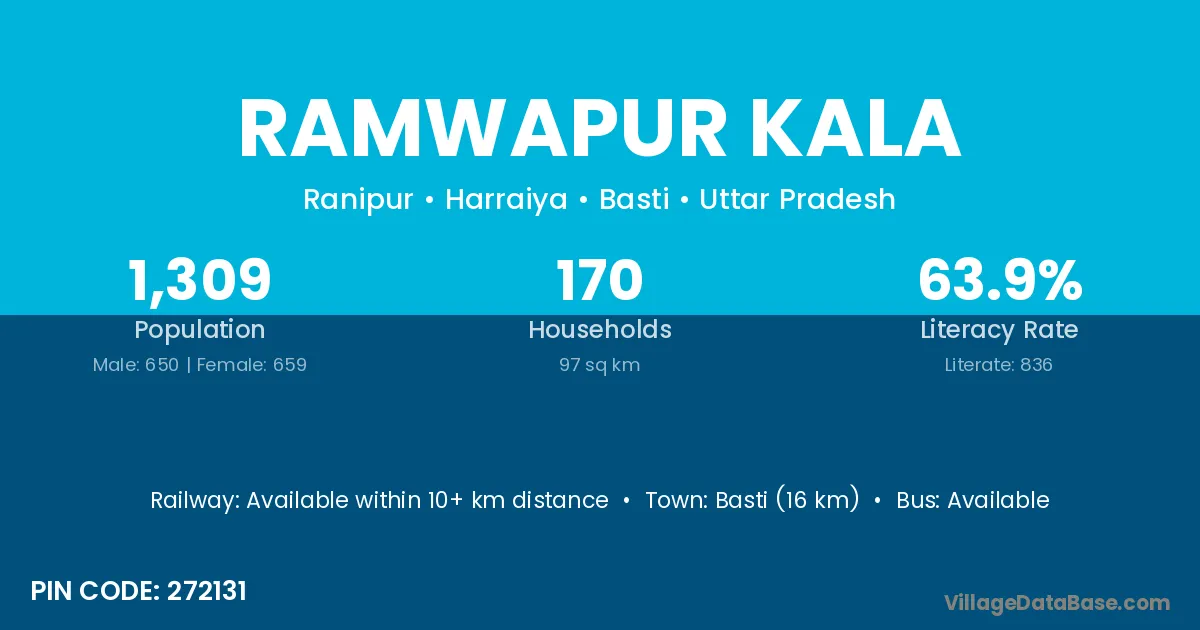 Basti (16 km) is the nearest town to Ramwapur Kala village for major economic activities and is located approximately 16 km away.