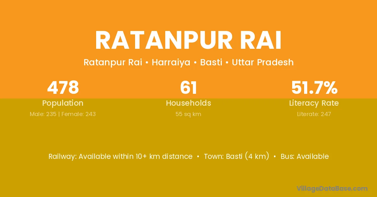 Basti (4 km) is the nearest town to Ratanpur Rai village for major economic activities and is located approximately 4 km away.