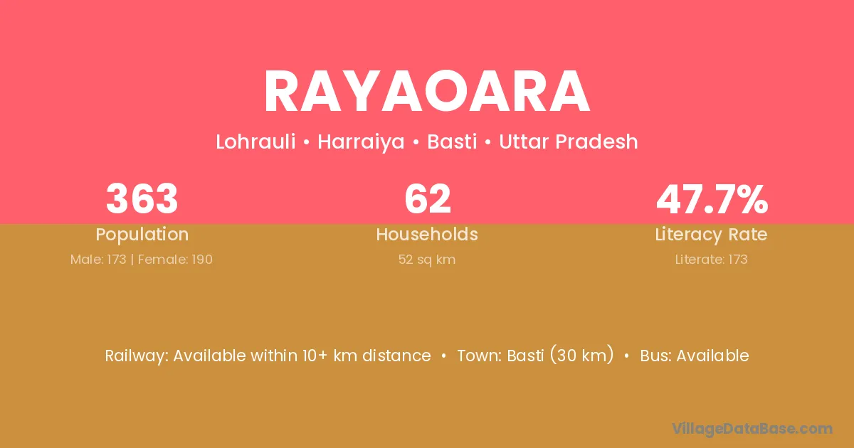 Basti (30 km) is the nearest town to Rayaoara village for major economic activities and is located approximately 30 km away.