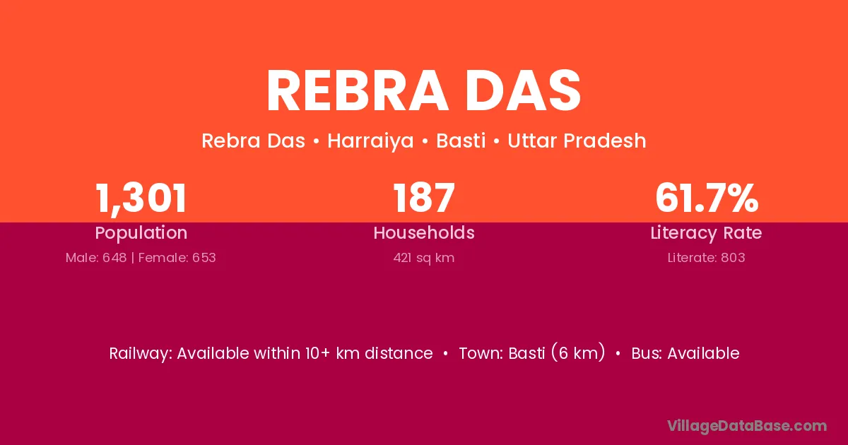 Basti (6 km) is the nearest town to Rebra Das village for major economic activities and is located approximately 6 km away.