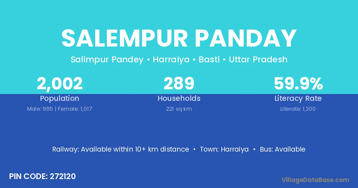Salempur Panday village has a total population of 2,002 people, of which 985 are males and 1,017 are females.