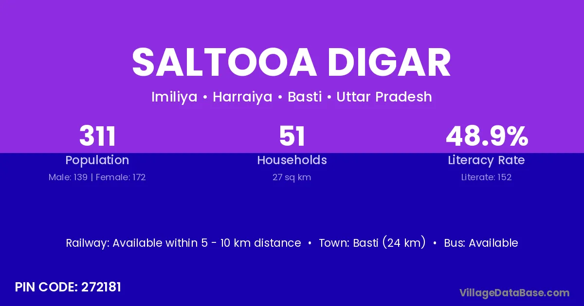 Basti (24 km) is the nearest town to Saltooa Digar village for major economic activities and is located approximately 24 km away.