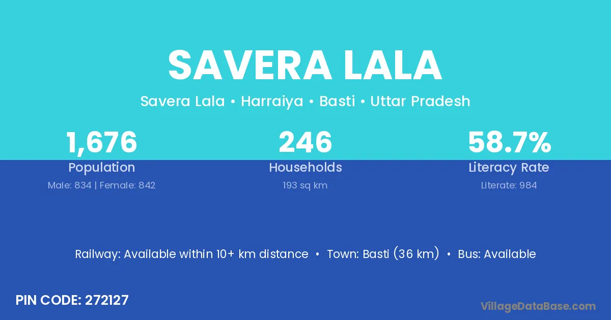 Basti (36 km) is the nearest town to Savera Lala village for major economic activities and is located approximately 36 km away.