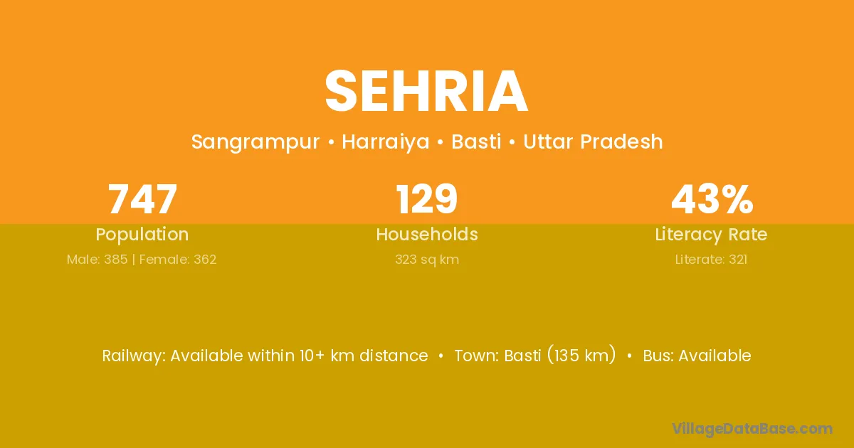 Basti (135 km) is the nearest town to Sehria village for major economic activities and is located approximately 135 km away.