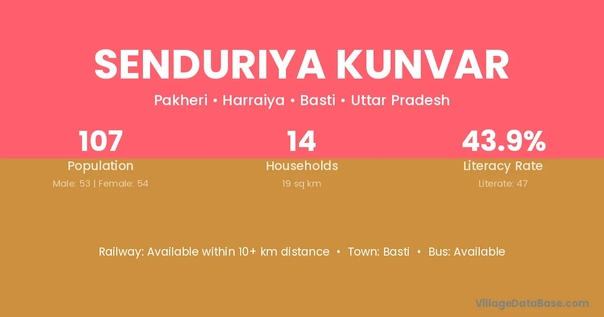Senduriya Kunvar village has a total population of 107 people, of which 53 are males and 54 are females.