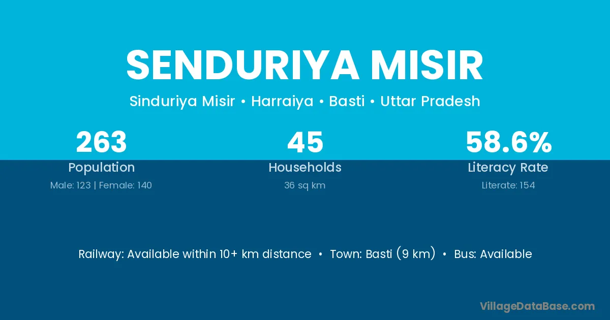 Basti (9 km) is the nearest town to Senduriya Misir village for major economic activities and is located approximately 9 km away.