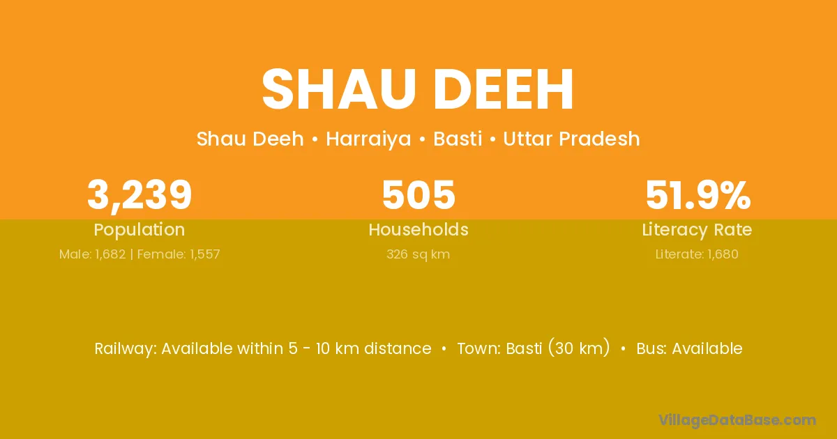 Basti (30 km) is the nearest town to Shau Deeh village for major economic activities and is located approximately 30 km away.
