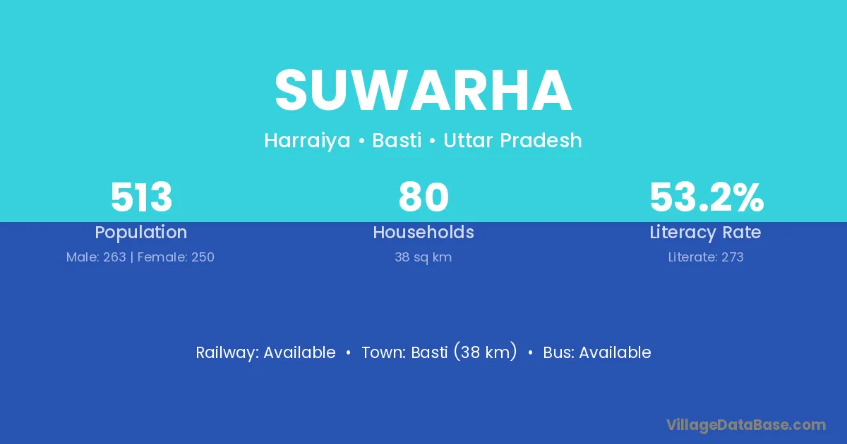 Basti (38 km) is the nearest town to Suwarha village for major economic activities and is located approximately 38 km away.