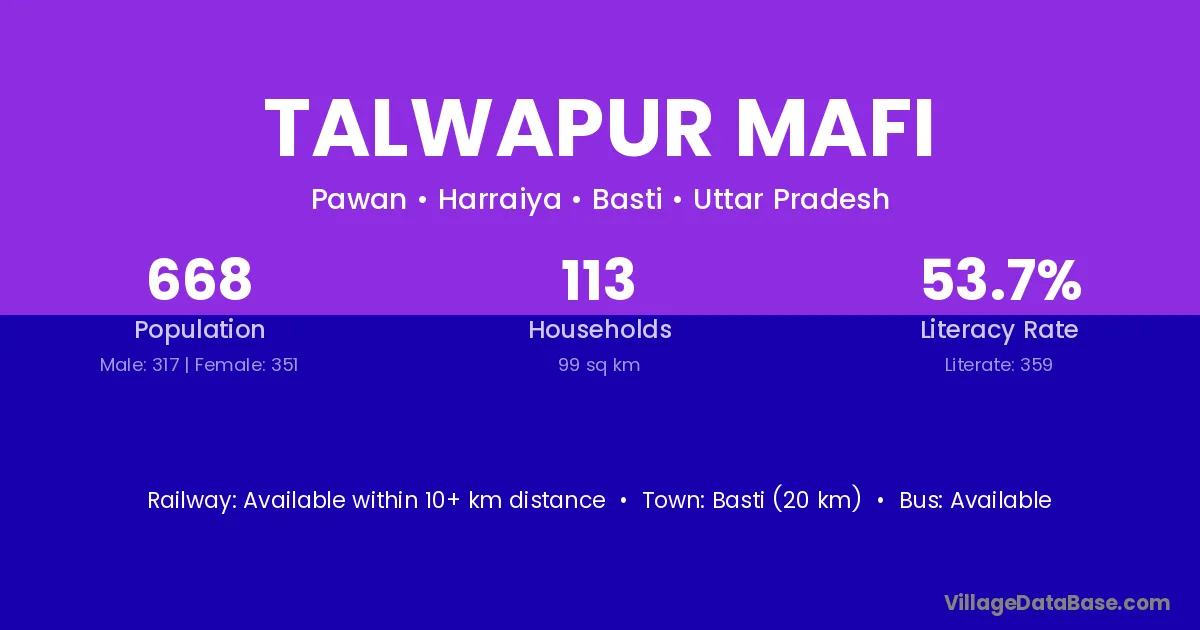 Basti (20 km) is the nearest town to Talwapur Mafi village for major economic activities and is located approximately 20 km away.