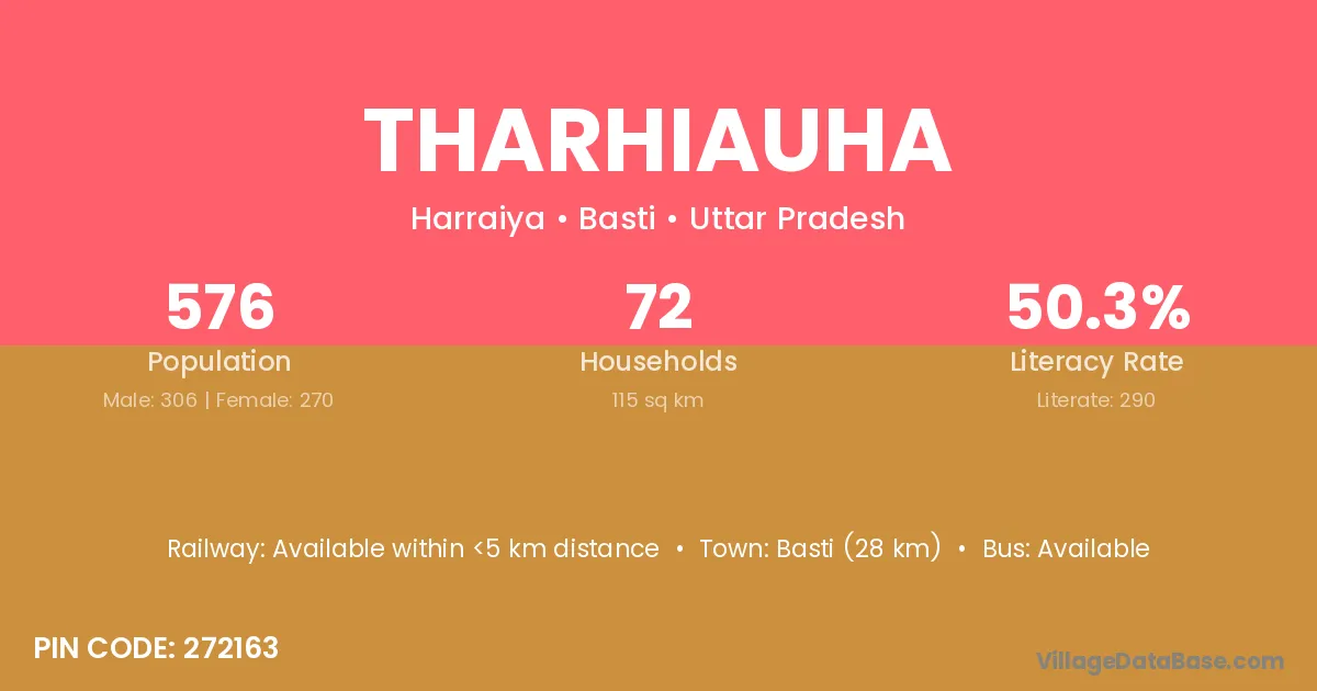 Basti (28 km) is the nearest town to Tharhiauha village for major economic activities and is located approximately 28 km away.