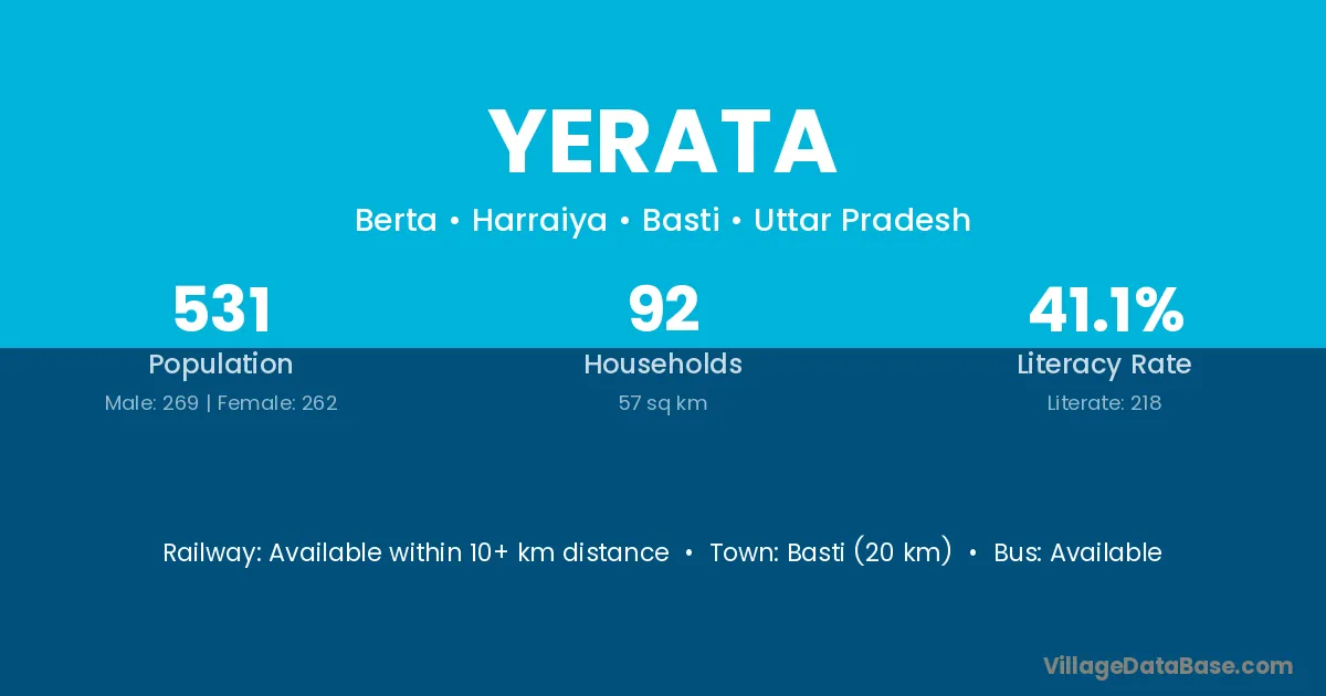 Basti (20 km) is the nearest town to Yerata village for major economic activities and is located approximately 20 km away.