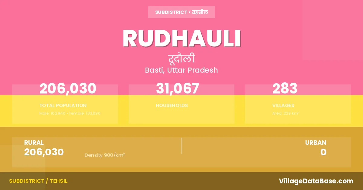 According to the 2011 census The total area of Rudhauli Tehsil is 229 km², with a population of 206030 people. The population density is 900 inhabitants per square kilometre, and there are approximately 31067 houses in the sub district.