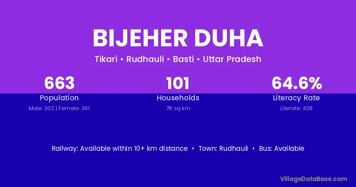 Bijeher Duha village has a total population of 663 people, of which 302 are males and 361 are females.