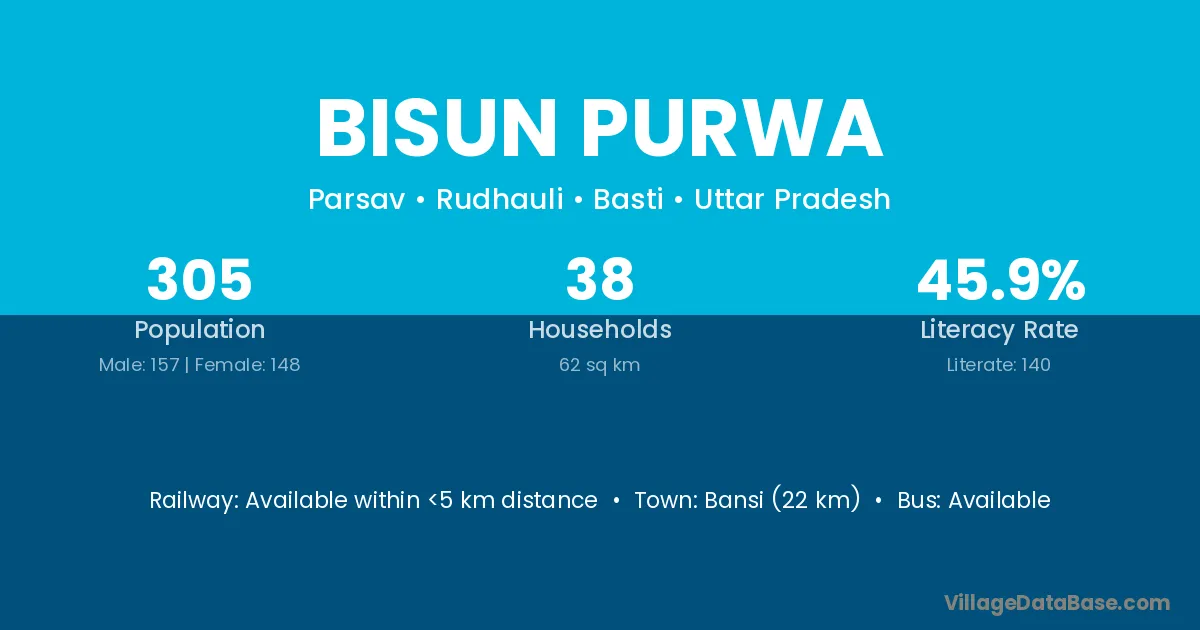 Bansi (22 km) is the nearest town to Bisun Purwa village for major economic activities and is located approximately 22 km away.