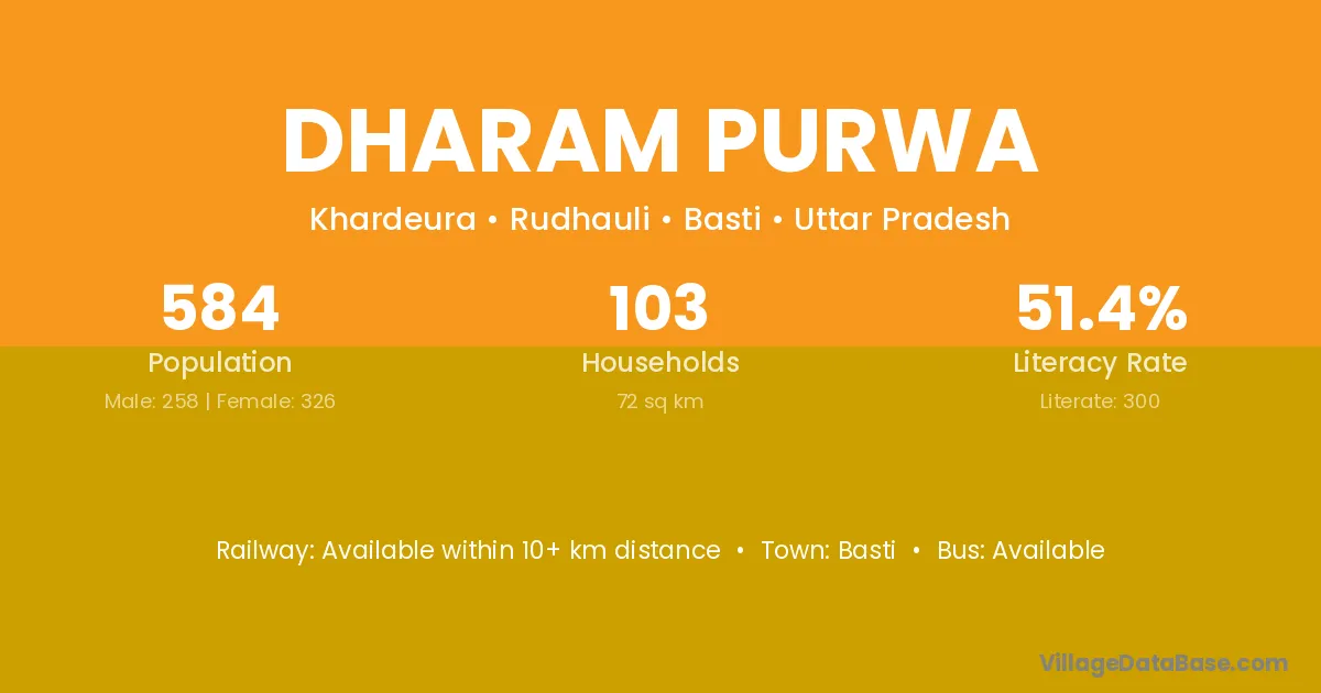 Dharam Purwa village has a total population of 584 people, of which 258 are males and 326 are females.