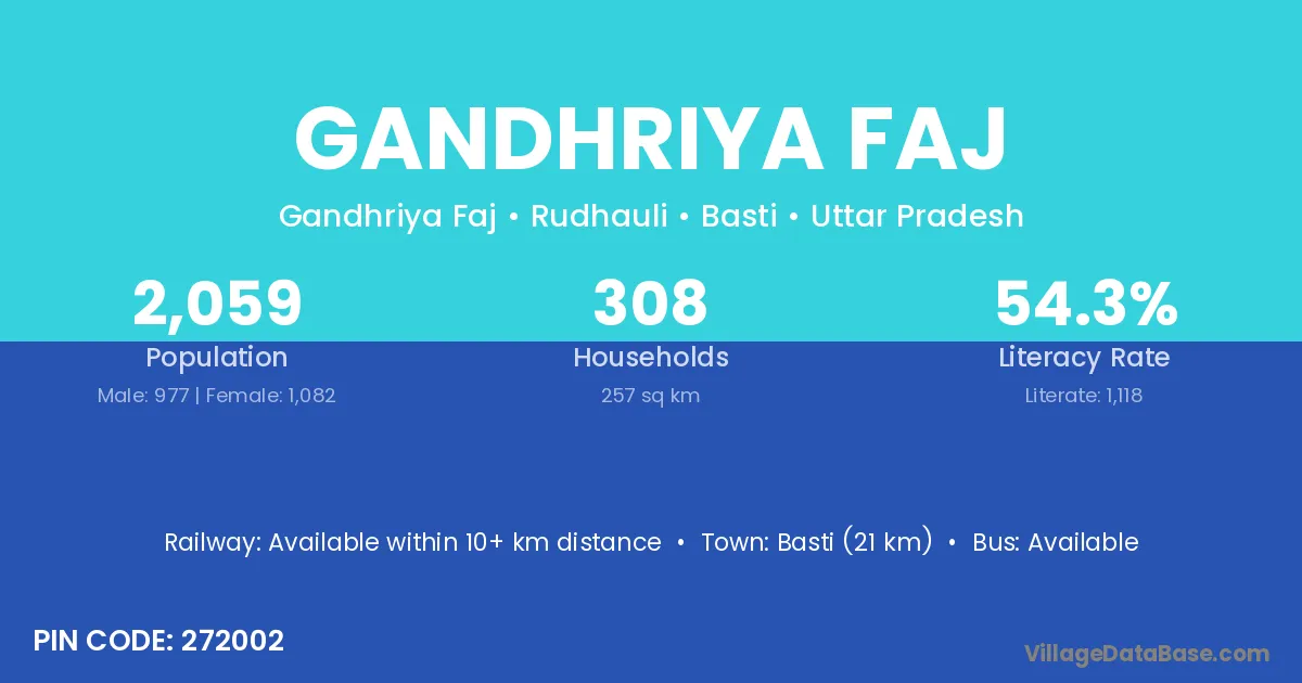 Basti (21 km) is the nearest town to Gandhriya Faj village for major economic activities and is located approximately 21 km away.