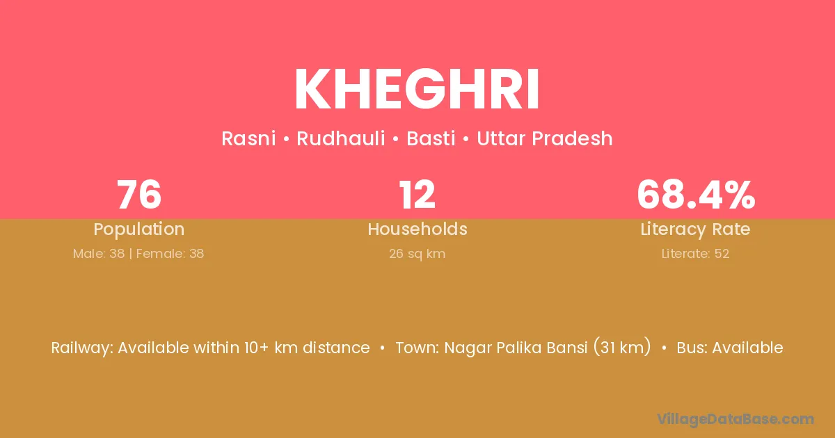 Kheghri village has a total population of 76 people, of which 38 are males and 38 are females.