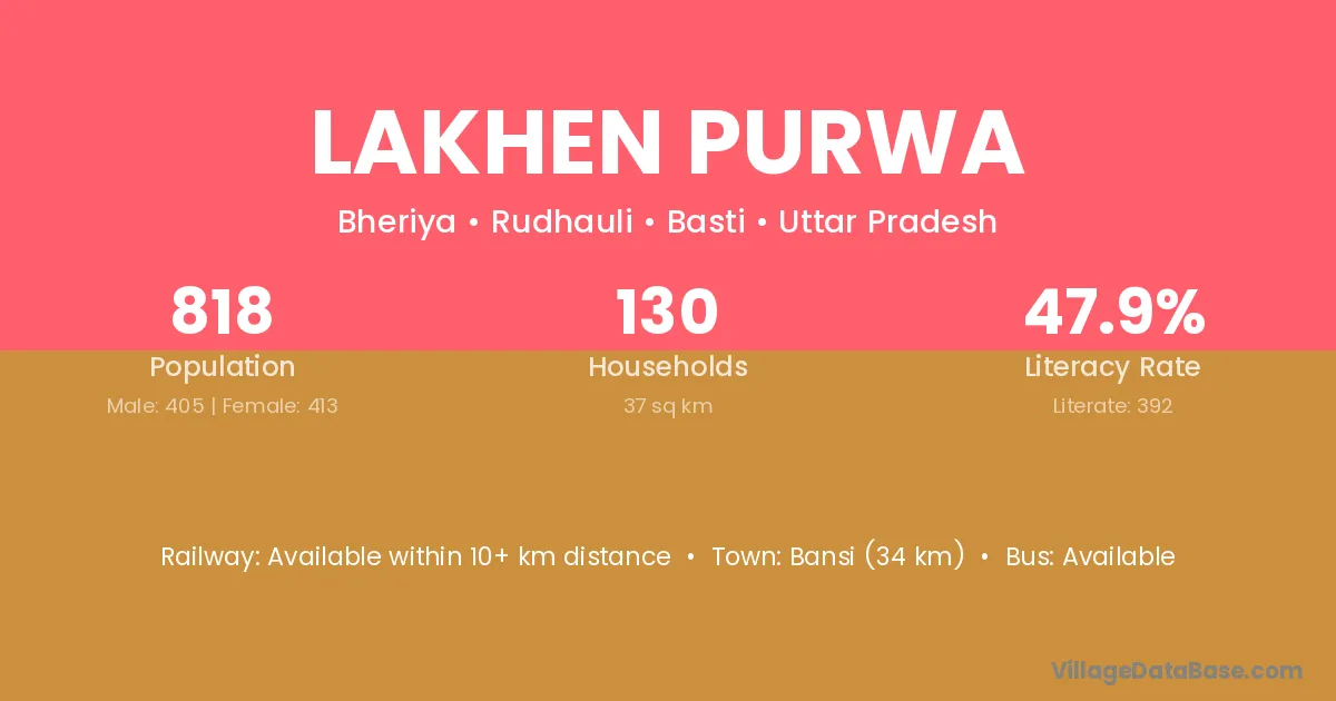 Bansi (34 km) is the nearest town to Lakhen Purwa village for major economic activities and is located approximately 34 km away.
