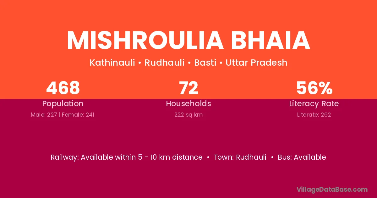 Mishroulia Bhaia village has a total population of 468 people, of which 227 are males and 241 are females.