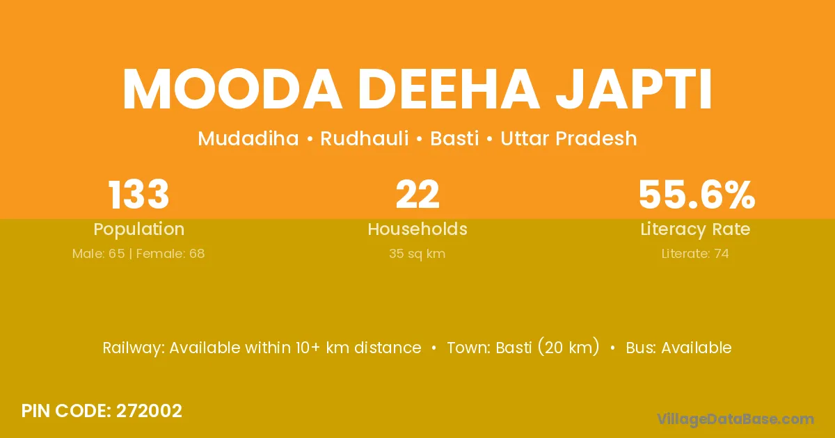 Basti (20 km) is the nearest town to Mooda Deeha Japti village for major economic activities and is located approximately 20 km away.