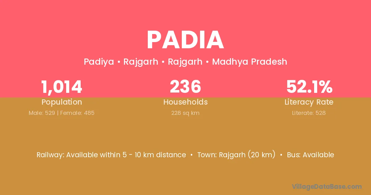 Basti (30 km) is the nearest town to Padia village for major economic activities and is located approximately 30 km away.