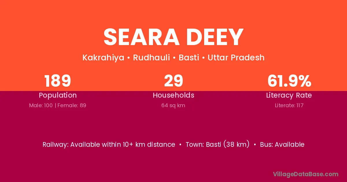 Basti (38 km) is the nearest town to Seara Deey village for major economic activities and is located approximately 38 km away.