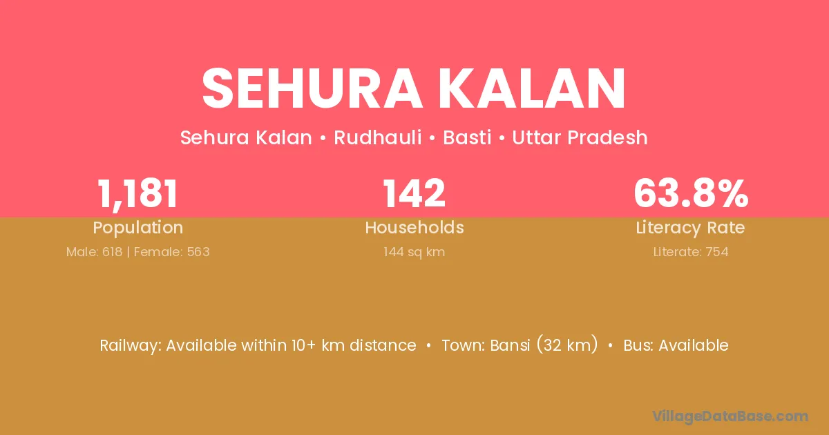 Bansi (32 km) is the nearest town to Sehura Kalan village for major economic activities and is located approximately 32 km away.