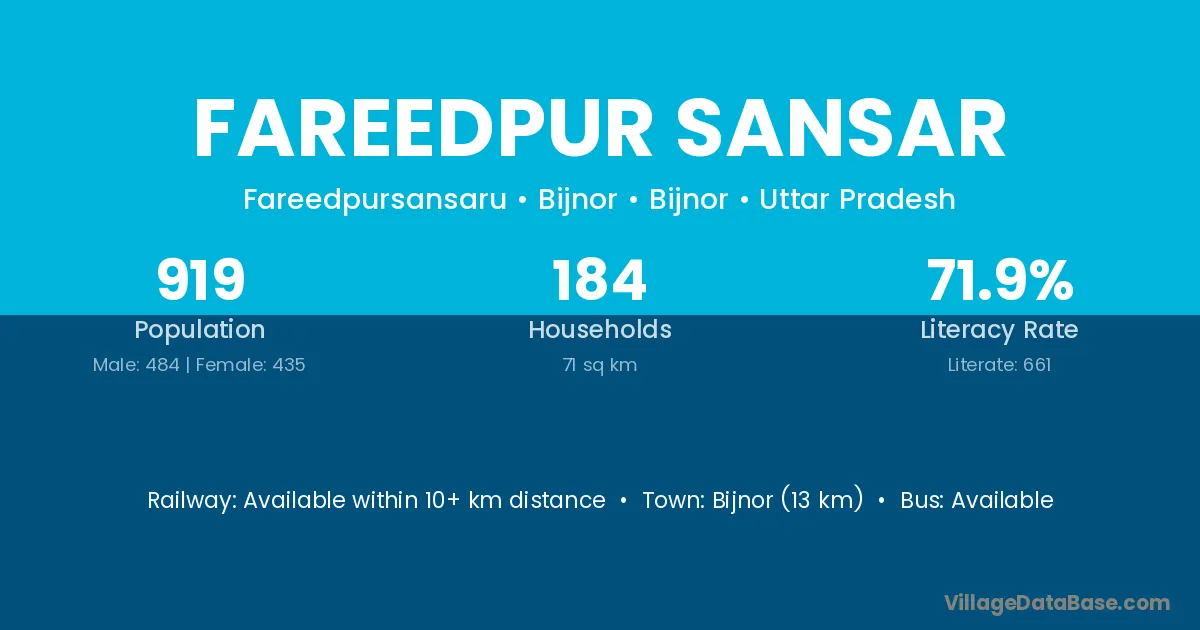 Bijnor (13 km) is the nearest town to Fareedpur Sansar village for major economic activities and is located approximately 13 km away.