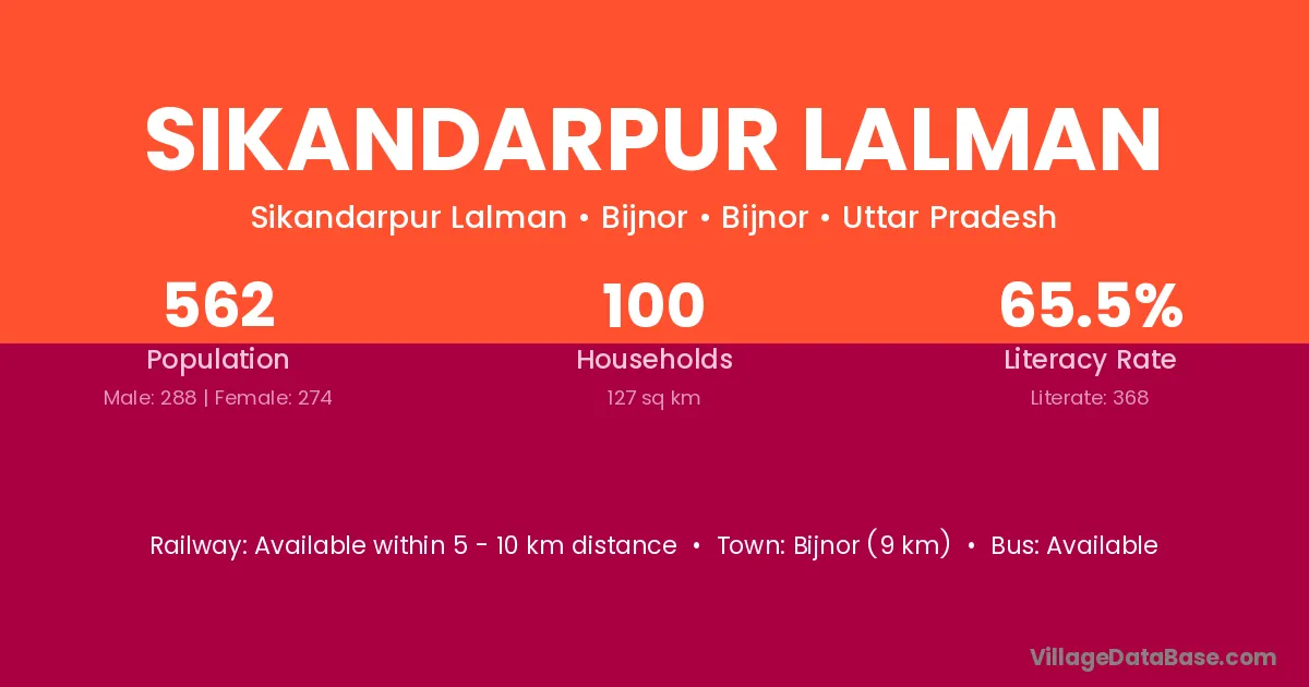 Sikandarpur Lalman village has a total population of 562 people, of which 288 are males and 274 are females.