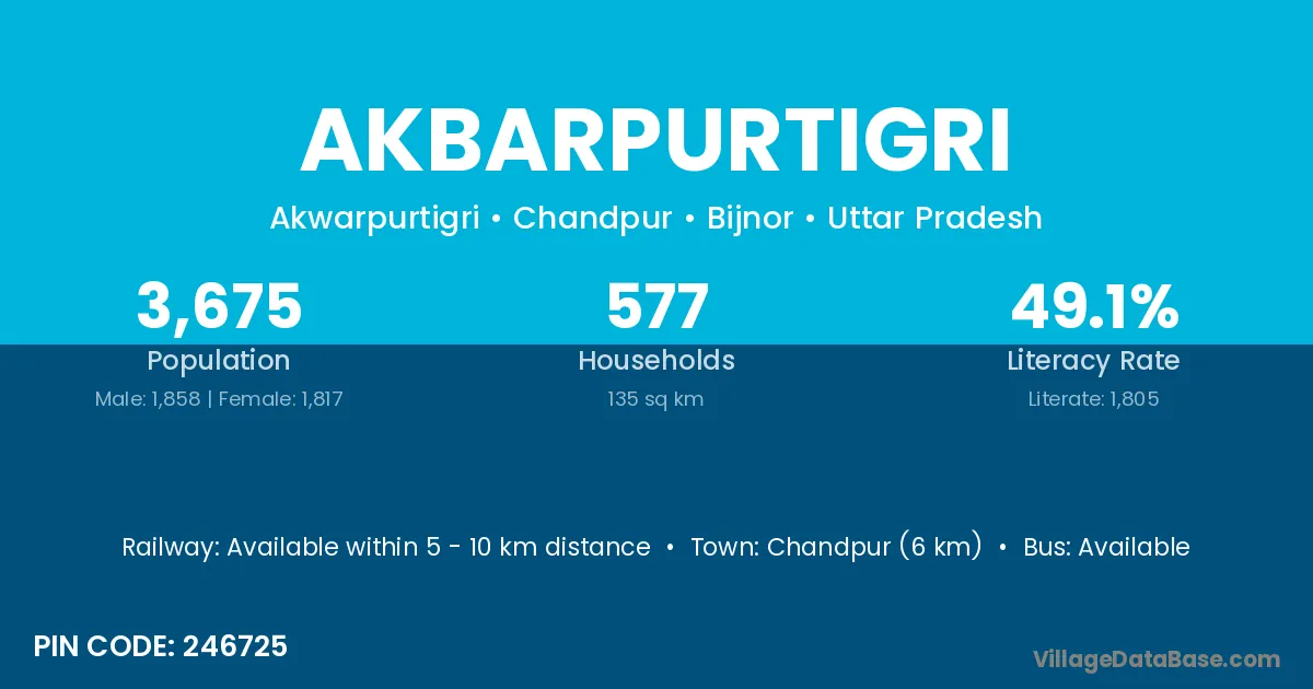 Akbarpurtigri village has a total population of 3,675 people, of which 1,858 are males and 1,817 are females.