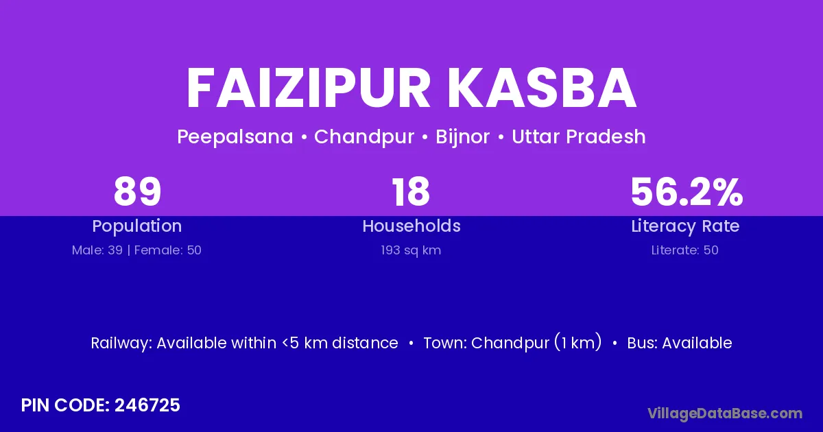 Faizipur Kasba village has a total population of 89 people, of which 39 are males and 50 are females.