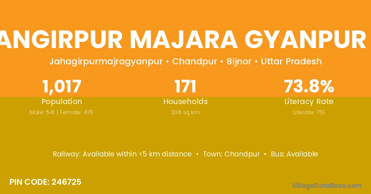 Jahangirpur Majara Gyanpur Roo village has a total population of 1,017 people, of which 541 are males and 476 are females.